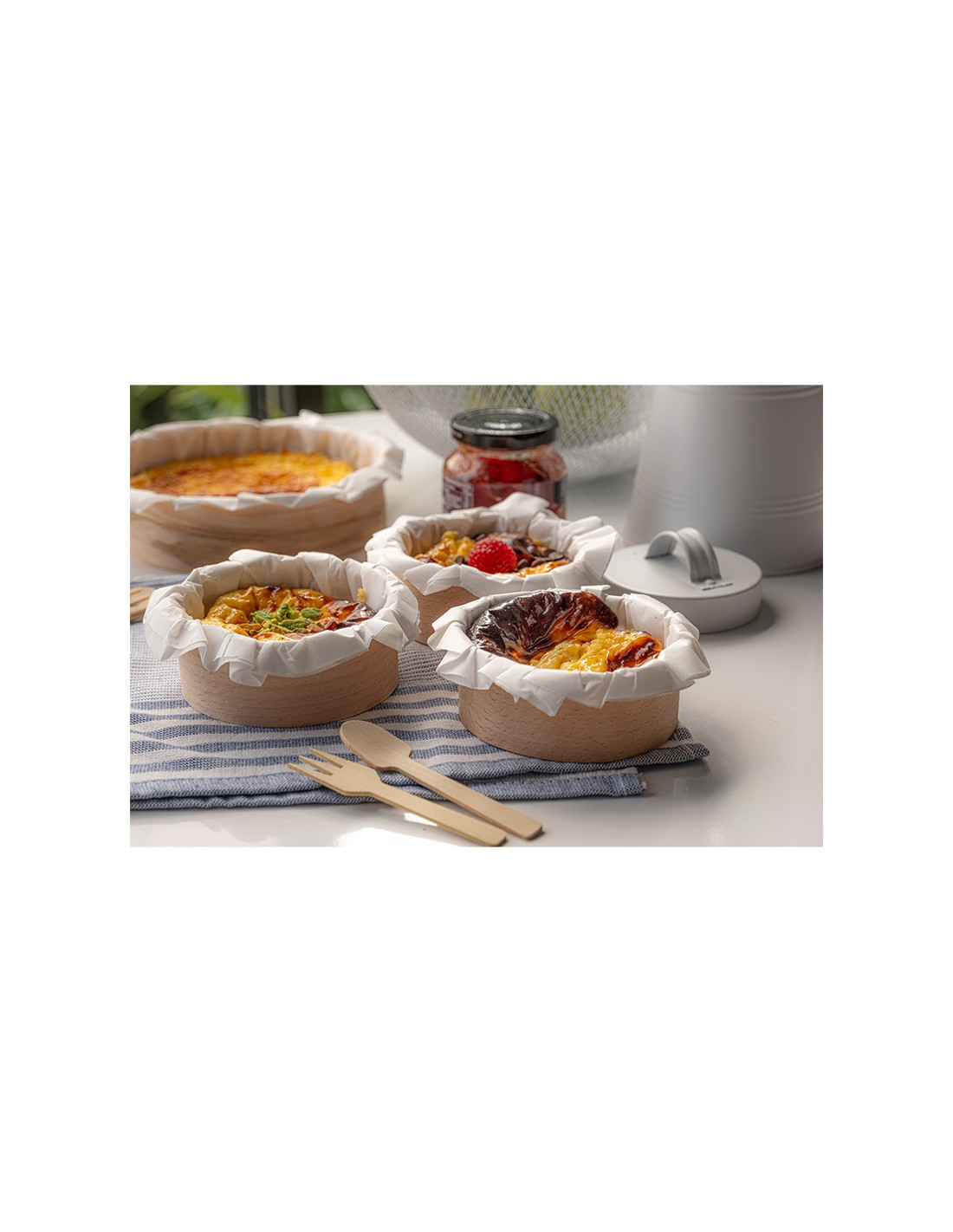 Molde de madera de haya circular con papel alimentario horneable de Ø100x40 mm.