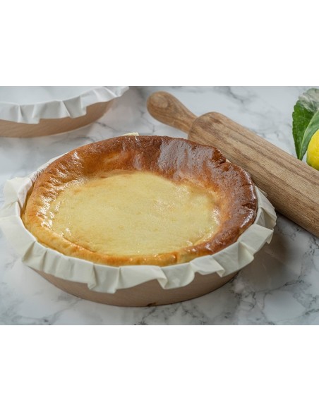 Molde de madera de haya circular con papel alimentario horneable de Ø120x40 mm.