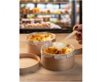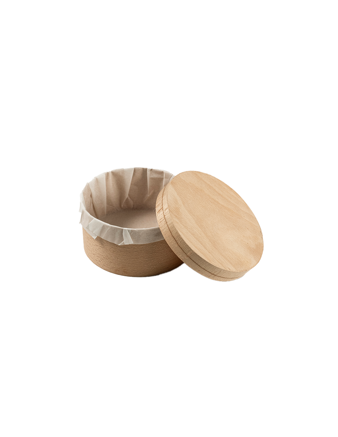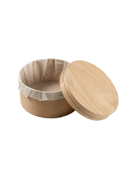 Envase redondo con tapa de madera elegante perfecto para transporte y presentación de pequeños platos. Este envase de madera tiene unas dimensiones de Ø90x40 mm.