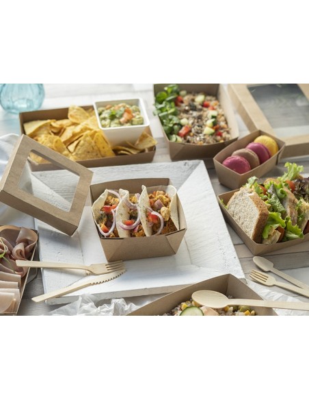 “Be recycled”, la colección de bandejas ecológicas para delivery, hechas de cartón con ventana transparente de celulosa 100% reciclables y compostables (directamente al contenedor azul). Personalizables y con una perfecta operativa para tu negocio. Con medidas 180x130x50 mm. Ideales para presentación de todo tipo de platos, ensaladas, fideos, arroz, fritos, todo lo que necesites para tu servicio de delivery y take away.