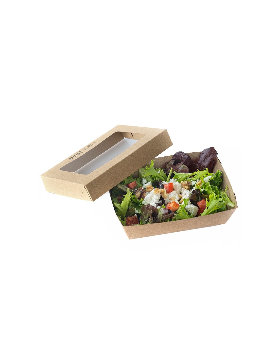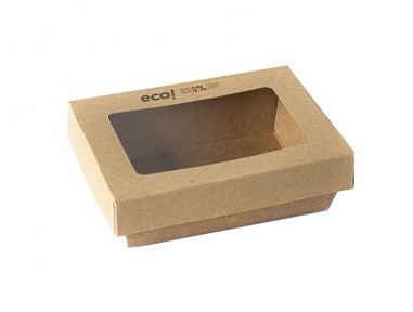 Bandeja de cartón + tapa de cartón con ventana transparente de acetato de celulosa (todo directamente al contenedor azul) en color kraft y con medidas 220x150x50
