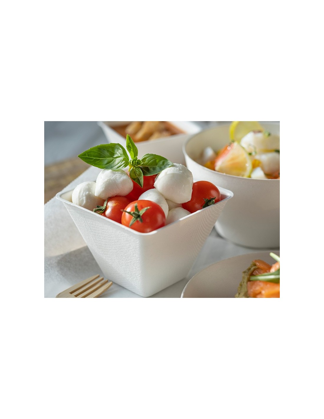 Mini bowl de caña de azúcar con medidas 65/32x65/32x45 mm con capacidad de 80 ml. Ideal para presentar alimentos y cualquier tipo de plato en cátering y eventos. Al disponer de tapa tambien es un buen producto para delivery y Take Away