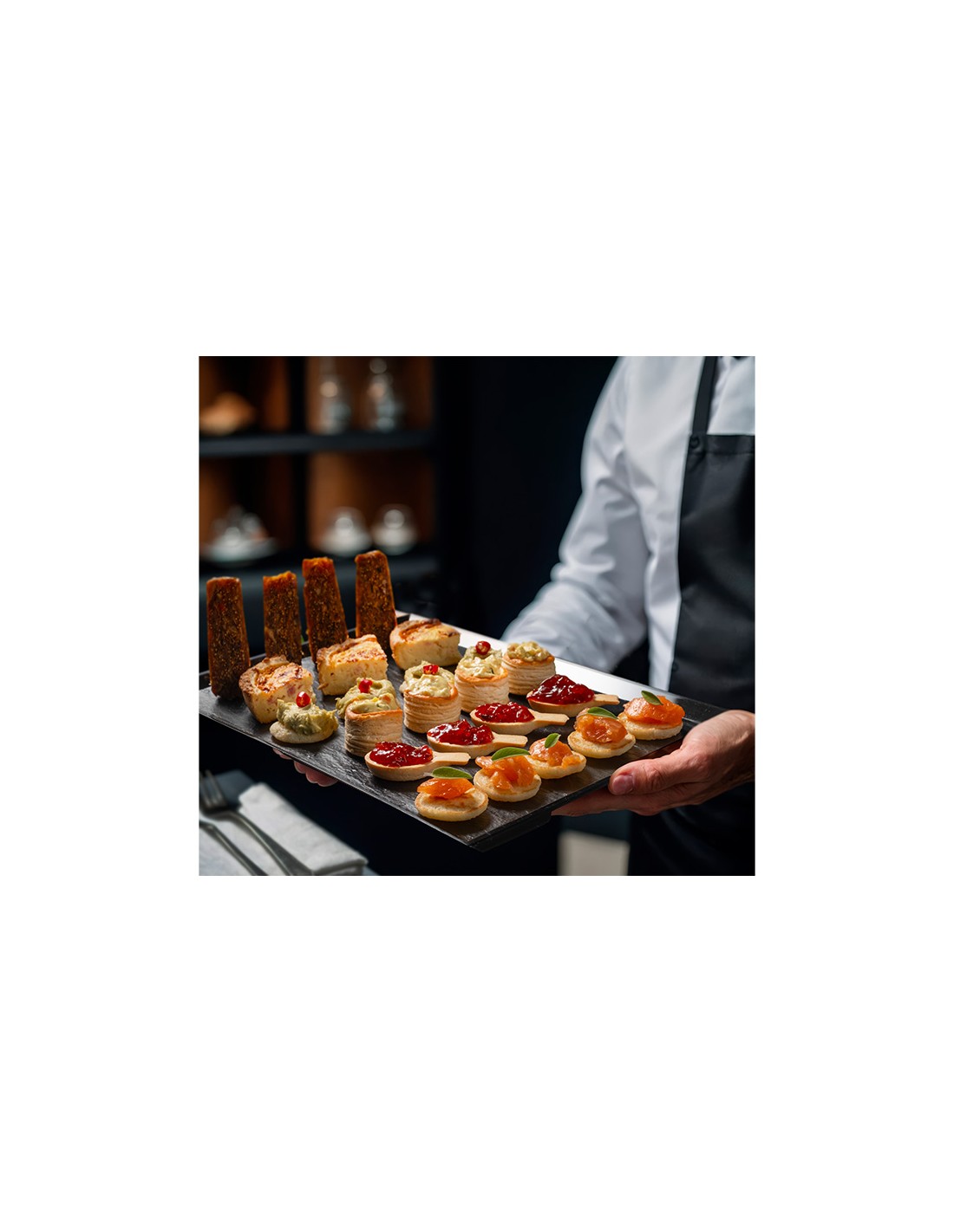 Las bandejas de plástico imitación pizarra son una magnífica opción para pastelerías y panaderías también como bandejas pizarra para degustación y bandejas para catering. Opción de tapa rPET (tapa de plástico reciclado y reciclable) para trasladar las bandejas alimentarias. Son bandejas de plástico impermeables con lo que no habrá problemas si se derraman líquidos. Además, son bandejas reutilizables.