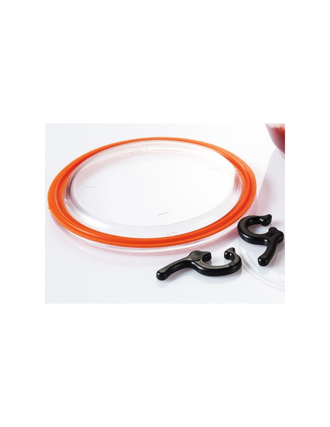 Color: vaso y tapa Transparente, junta naranja, clips negros.